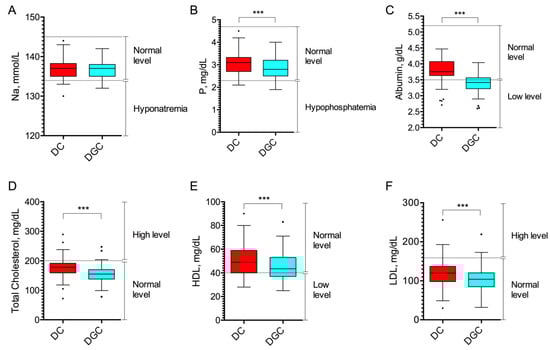 Instead, we analyzed the levels of sodium (Na+), a critical cation for maintaining fluid balance, blood pressure, plasma osmolarity, and phosphorus (P), involved in various body functions, including bone health, energy production, and cell membrane integrity. No difference in Na+ levels was observed between DC and DGC groups, with calculated mean concentrations of 137.1 ± 2.63 mmol/L (95% CI [136.4–137.9]) in the DC group and 136.9 ± 2.05 mmol/L (95% CI [136.3–137.5]) in the DGC group (p = 0.31, Figure 3A). P was slightly reduced in the DGC group, which presented a mean concentration of 2.84 ± 0.50 mg/dL (95% CI [2.69–2.98]), as compared to the DC group exhibiting a mean concentration of 3.09 ± 0.51 mg/dL (95% CI [2.94–3.23]; p < 0.0001, Figure 3B).