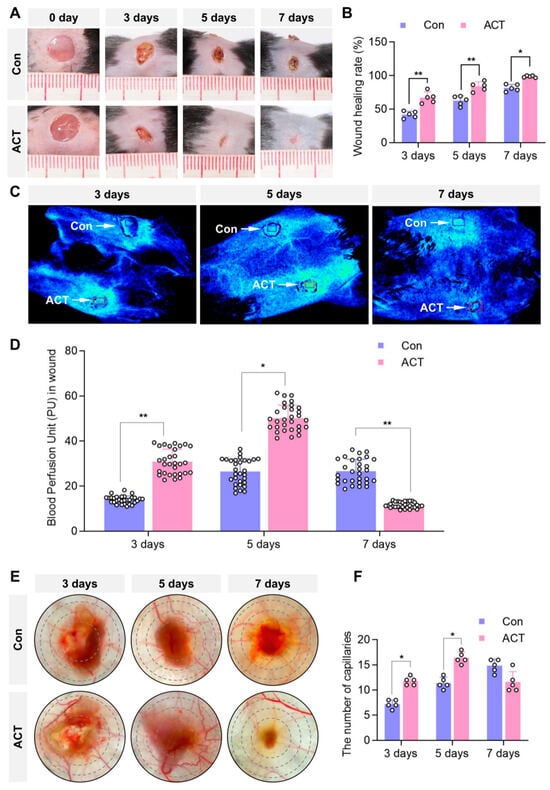 Activin B promotes skin-wound closure and enhances average blood perfusion in mice. (A) Representative images of dorsal wound healing in both groups (the wound healing images from days 1 to 7 were derived from the same mouse). (B) Statistical analysis of the wound-healing rates in both groups, n = 5. (C) Laser speckle microcirculation imaging system detecting average blood perfusion within identically sized regions of bilateral dorsal wounds in the same mouse (blue box: control group; red box: Activin B group). (D) Statistical analysis of the blood perfusion unit in the wounds in both groups, PU: perfusion unit, n = 30. (E) The wound transillumination test was used to measure the capillary density within the granulation tissue surrounding the wounds in both groups. (F) Statistical analysis of capillary density in the wound granulation tissue, n = 5. Con: Control group. ACT: Activin B group. * p < 0.05, ** p < 0.01. The small white circles represent the number of replicates, n = 5.