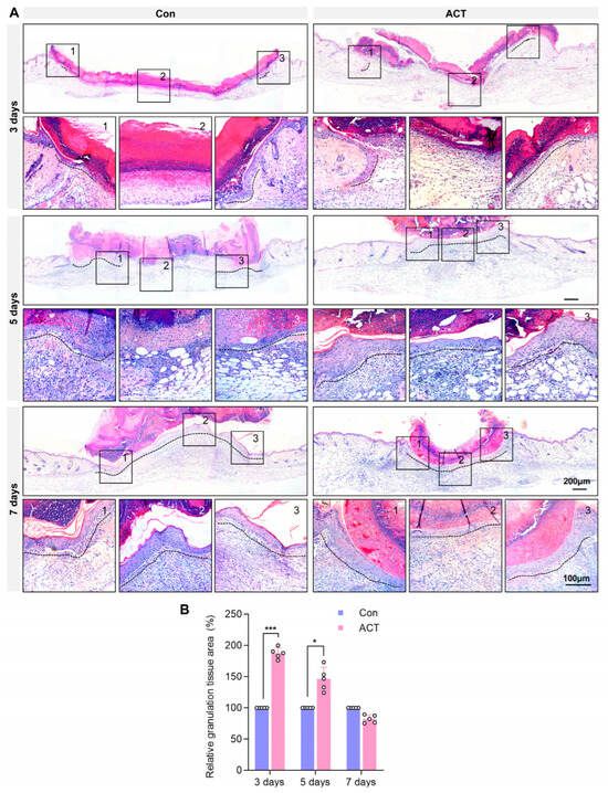 Activin B promotes the formation of granulation tissue in wounds. (A) Hematoxylin and eosin staining showing wound granulation tissue in both groups. The numbers 1, 2, and 3 in the black box correspond to 1, 2, 3 in the high-magnified image below. (B) Statistical analysis of the relative area of wound granulation tissue in both groups, with black dashed lines indicating re-epithelialization, n = 5. Con: Control group. ACT: Activin B group. * p < 0.05, *** p < 0.001.