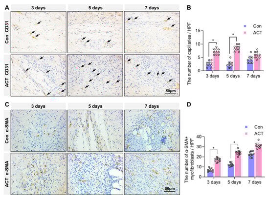 Furthermore, immunohistochemical detection of CD31, a marker of vascular endothelial cells, was performed to assess angiogenesis in the granulation tissue at the wound site. The results revealed that on postoperative days 3 and 5, the number of CD31-positive capillaries within the granulation tissue at the wound sites was significantly higher in the Activin B group than in the control group. By postoperative day 7, there was no significant difference in capillary numbers between the two groups (Figure 3A,B). Immunohistochemical analysis of α-SMA-positive myofibroblasts within the granulation tissue showed a significantly greater number of myofibroblasts on postoperative days 3 and 5 in the Activin B group than in the control group. On postoperative day 7, the number of α-SMA-positive myofibroblasts was comparable between the two groups (Figure 3C,D). These findings indicate that Activin B promotes granulation tissue formation, enhances angiogenesis, and facilitates fibroblast-to-myofibroblast differentiation during the early proliferative phase of wound healing.