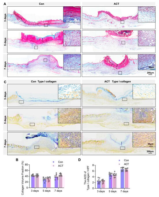 Further analysis focused on the granulation tissue composition. Masson’s trichrome staining, which was used to assess collagen fiber content within the granulation tissue, revealed no significant differences in collagen fiber content within granulation tissues between the Activin B and control groups on postoperative days 3, 5, and 7. Quantification of the collagen volume fraction (CVF) confirmed this absence of a difference (Figure 4A,B). Similarly, immunohistochemical analysis detected the expression of Type I collagen, the primary constituent of collagen fibers, in the granulation tissue. The average optical density (AOD) value of Type I collagen under high-power magnification also showed no significant difference between the Activin B and control groups (Figure 4C,D). These findings indicate that Activin B does not regulate the synthesis of collagen fibers or their primary component, Type I collagen, in wound granulation tissue.
