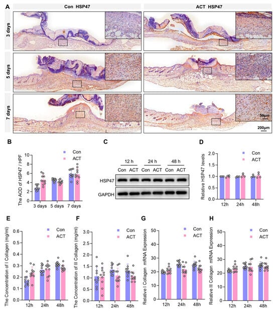 During the wound healing process, fibrocytes transform into more active fibroblasts, which serve as the primary cell type synthesizing collagen and collagen fibers. HSP47, a collagen-specific molecular chaperone, shows significantly increased expression during fibroblast collagen synthesis [27]. We further investigated HSP47-positive fibroblasts in wound sites using immunohistochemistry (Figure 5A). Statistical analysis of the number of HSP47-positive fibroblasts in HPF revealed that although the Activin B group had higher HSP47-positive fibroblasts than the control group, this difference was not statistically significant (Figure 5B). To investigate whether Activin B regulates collagen secretion in HDFs in vitro, we first detected HSP47 expression levels after Activin B stimulation via Western blot (Figure 5C). Statistical analysis of the relative gray values showed that HSP47 expression levels in human skin fibroblasts increased slightly at 12, 24, and 48 h after Activin B stimulation compared to the control group, but the differences were not statistically significant (Figure 5D). Enzyme-linked immunosorbent assay (ELISA) kits were used to quantify type I and III collagen content in fibroblast supernatants, while reverse transcription-polymerase chain reaction (RT-PCR) quantified precursor mRNA levels of these collagen types. ELISA analysis detected 10 ng/mL Activin B-stimulated fibroblast cultures at 12, 24, and 48 h, measuring type I and III collagen levels in the supernatant. Results showed no significant difference between the control and Activin B groups (Figure 5E,F). RT-PCR results indicated no notable variation in type I and III collagen precursor mRNA content within the cultured fibroblasts of both groups (Figure 5G,H).
