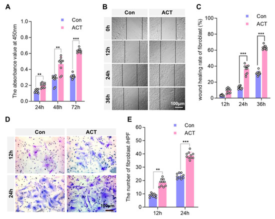 Activin B promotes fibroblast proliferation and migration. (A) CCK-8 assay to assess the proliferation of human dermal fibroblasts (HDFs), n = 10. (B) Representative images of the scratch wound-healing assay. (C) Quantification of the scratch wound-healing rate. (D) Representative images of the Transwell migration assay, n = 10. (E) Quantification of migrated HDFs in the Transwell assay, n = 10. Con: Control group. ACT: Activin B group. HPF: High Power Field; CCK, cell counting kit. ** p < 0.01, *** p < 0.001.