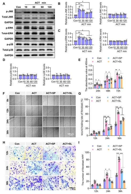 To delineate the roles of the JNK and ERK signaling pathways, we used the JNK-specific inhibitor SP600125 and the ERK-specific inhibitor SL-327. Firstly, the WB experiment was used to detect the inhibitory effect of 5 μm SP600125 and 5 μm SL-327 on the phosphorylation activity of JNK and ERK, respectively. Statistical analysis showed that compared with the ACT group, 5 μm SP600125 and 5 μm SL-327 significantly reduced ACT-induced phosphorylation levels of JNK and ERK, respectively (Supplementary Figure S1). In the CCK-8 assay, Activin B significantly enhanced fibroblast growth at 24 h, 48 h, and 72 h. However, following treatment with SP600125 and SL-327 inhibitors, stimulation with Activin B resulted in a significantly lower fibroblast proliferation rate than that observed in the Activin B group alone (Figure 7E). Similarly, scratch assay results revealed that Activin B significantly increased both the number of migrated cells and the wound closure rate at 24 h and 36 h. Following treatment with SP600125 and SL-327 inhibitors, the number of migrated fibroblasts and their migration rate were significantly lower than those in the Activin B group after subsequent Activin B stimulation. Migration experiments demonstrated that Activin B regulated fibroblast migration via the JNK and ERK signaling pathways (Figure 7F,G). Transwell assays showed that Activin B significantly increased the number of invading fibroblasts after 24 h and 36 h. Following treatment with SP600125 and SL-327 inhibitors and Activin B stimulation, the number of fibroblasts exhibiting chemotactic migration was significantly lower than that in the Activin B group (Figure 7H,I). Collectively, these data demonstrate that Activin B regulates fibroblast proliferation and migration by activating JNK and ERK signaling pathways.