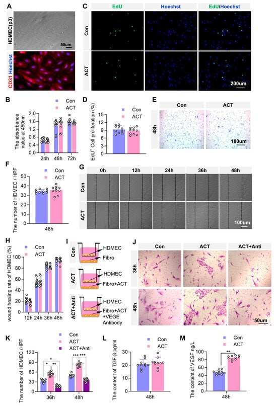 Activin B may promote angiogenesis by facilitating fibroblast-derived VEGF secretion to regulate the proliferation of human dermal microvascular endothelial cells. (A) Light microscopy and CD31 immunofluorescence staining identifying HDMECs. (B) CCK-8 assay assessing HDMECs proliferation, n = 10. (C) Representative EdU assay images of HDMECs proliferation. (D) Quantification of EdU-positive HDMEC counts, n = 10. (E) Representative Transwell assay images of HDMECs. (F) Quantification of migrated HDMECs in the Transwell assay, n = 10. (G) Representative scratch wound-healing assay images of HDMECs. (H) Quantification of the scratch wound closure rate, n = 10. (I,J) Schematic of the Transwell co-culture model: HDMECs (upper chamber) and HDFs (lower chamber). (K) Quantification of HDMECs in the upper chamber of Transwell co-culture, n = 10. (L) ELISA measurement of TGFβ1 in fibroblast supernatant, n = 10. (M) ELISA measurement of VEGF in fibroblast supernatant, n = 10. p3: Passage; Con: Control group. ACT: Activin B group. HPF: High Power Field. ELISA, enzyme-linked immunosorbent assay; HDMECs, human dermal microvascular endothelial cells; Fibro: Fibroblast; Anti: Antibody; VEGF, vascular endothelial growth factor; HDFs, human dermal fibroblasts; CCK, cell counting kit. * p < 0.05, ** p < 0.01, *** p < 0.001.