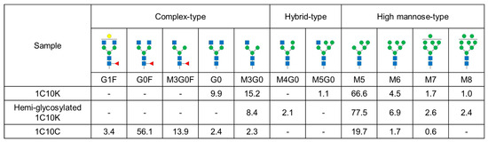The N-glycan structures of 1C10K and 1C10C were analyzed by matrix-assisted laser desorption/ionization time-of-flight mass spectrometry (MALDI-TOF MS). The percentages of detected glycan structures are shown in Figure 2. In 1C10K, high-mannose-type glycans accounted for 73.8% of the total, while complex-type glycans accounted for 25.1%. In the complex-type glycans, neither core fucosylation nor galactosylation was detected. In contrast, the majority of glycans in 1C10C were complex-type (78.1%), most of which had core fucosylation. The high-mannose-type glycans accounted for 22.0%. We further analyzed the glycan structures of the hemiglycosylated form of 1C10K after fractionation by CEX. The distribution of glycan structures was similar to that of 1C10K before separation, but the percentage of high-mannose-type glycans in the hemiglycosylated form (89.4%) was higher than in the unseparated 1C10K (73.8%).