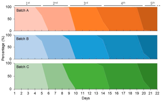 Larval instar transition. The percentages of larvae at each instar stage (from first to fifth) on each rearing day are shown. Batches A, B, and C are represented by red, blue, and green, respectively. Darker shading indicates later instar stages, with the corresponding stage indicated above.