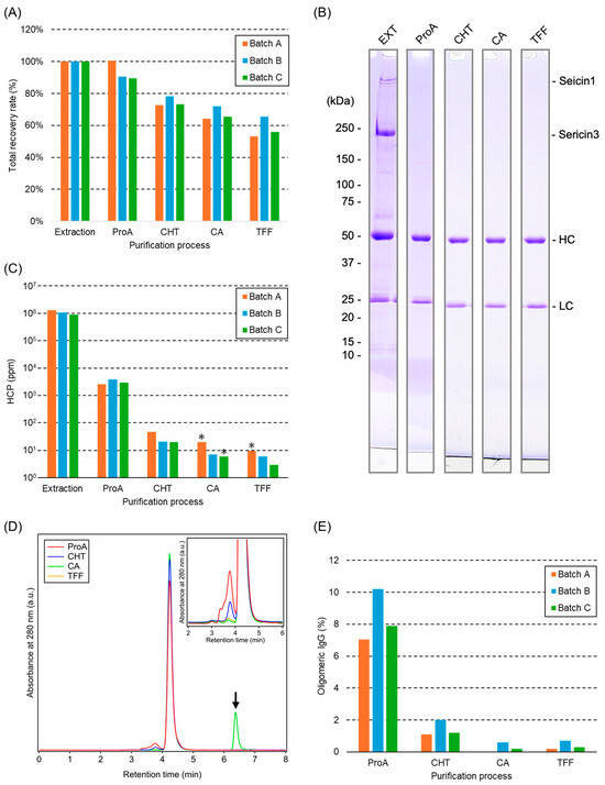 Process analyses of three batches of pilot-scale purification involving extraction (EXT), Protein A chromatography (ProA), ceramic hydroxyapatite chromatography (CHT), multimodal anion exchange chromatography (CA), and tangential flow filtration (TFF). (A) Trends in the recovery rates of 1C10K for each purification process. (B) SDS-PAGE under reducing conditions for each purification step in batch B. HC and LC indicate heavy and light chains of IgG, respectively. (C) Residual host cocoon proteins (HCP) levels, measured by an HCP assay. Asterisks indicate values below the lower limit of quantitation, and in such cases, the height of the bars represents those limits. (D) Size exclusion chromatography (SEC) chromatograms of each purification step in batch B. Black arrow indicates citric acid, a component of the sample solution. Inset shows a detailed view of elution peaks of the oligomeric IgGs. (E) Ratio of residual oligomeric IgGs measured by SEC.