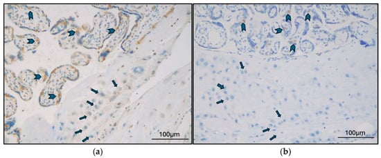 (a) Late-onset PE case (MVM), TFEB-B expression in CTB (arrowheads), and negative ETB (arrows) (original magnification 200×); (b) GD case (MVM+DVM), TFEB-SC expression in CTB (arrowheads), and negative EVT (arrows) (original magnification 200×).
