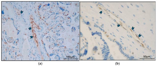 GD case (MVM+DVM), (a) TFEB-B expression in stem villi vessels (arrowheads) (Original magnification 400×) and (b) TFEB-SC expression in stem villi vessels (arrowheads) (Original magnification 200×).