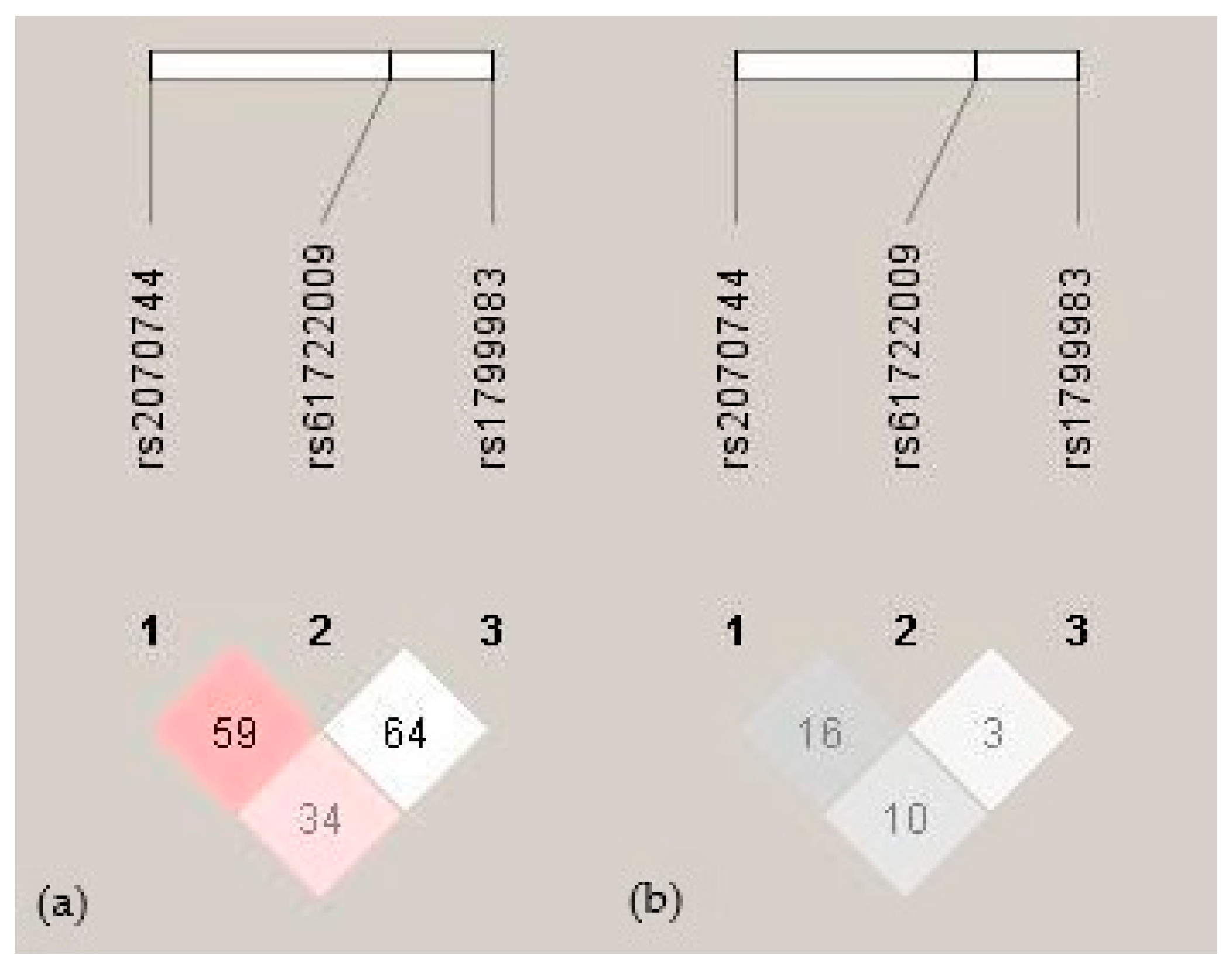 - Barrett, J.C.; Fry, B.; Maller, J.; Daly, M.J. Haploview: Analysis and Visualization of LD and Haplotype Maps. Bioinformatics 2005, 21, 263–265. [Google Scholar] [CrossRef]