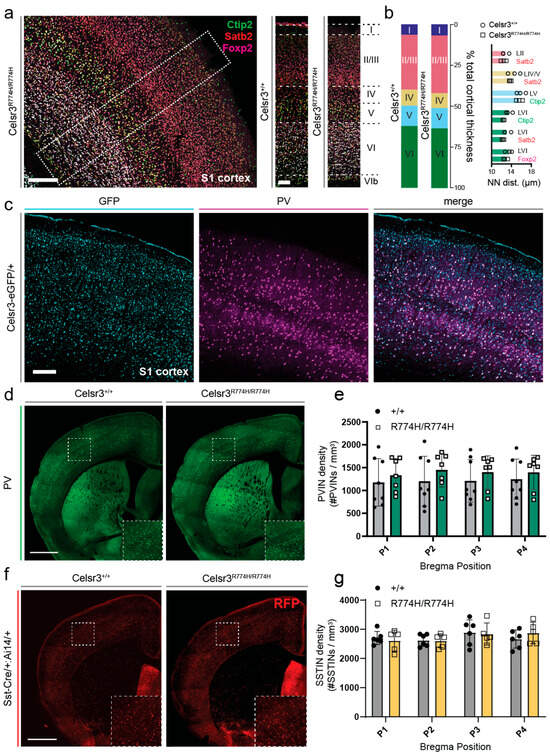 Cortical layering, as assessed by TBR1, CTIP2, and SATB2 immunostaining, was normal in Celsr3R774H/R774H animals compared to littermate controls (Figure 4a). The relative radial thickness of each cortical layer was also normal in Celsr3R774H/R774H animals (Figure 4b), and nearest neighbor (NN) analysis showed normal distribution of labelled cortical neurons (Figure 4b, p = 0.2275, 2-way ANOVA). Celsr3 is expressed by E13.5 in the ganglionic eminences, which give rise to cortical and striatal interneurons, and regulates the tangential migration of cortical interneurons [46]. Immunolabeling against parvalbumin showed that the density of cortical parvalbumin interneurons was normal in Celsr3R774H/R774H mice, despite variable staining differences that occurred in thick sections from both wild-type and mutant mice (Figure 4d,e). Using Somatostatin-Cre and the R26:Ai14 reporter line to lineage label somatostatin interneurons, there were also no differences in density within the cortex of Celsr3R774H/R774H mice (Figure 4f,g). Thus, cell proliferation and the radial and tangential migration of cortical pyramidal neurons and interneurons, respectively, appeared normal in Celsr3R774H/R774H animals.