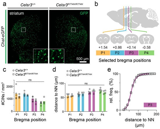 Celsr3R774H-mutant mice have no detectable loss of cholinergic striatal interneurons. (a) Representative images of Celsr3+/+; Chat-eGFP and Celsr3R774H/R774H; Chat-eGFP striatum. Scale bar represents 500 µm. (b) Four axial positions were chosen to quantify the density of interneurons. (c) Density of GFP+ Cholinergic interneurons in Celsr3+/+ (n = 7) and Celsr3R774H/R774H (n = 10) striatum at four axial positions (p = 0.6728, 2-way ANOVA, ns: not significant). (d) Distance to the nearest neighbor (NN) from counted cholinergic interneurons in Celsr3+/+ (n = 7) and Celsr3R774H/R774H (n = 10) striatum at four axial positions (p > 0.05, 2-way ANOVA). (e) Distribution of distances to cholinergic neurons’ nearest neighbors in one representative axial position (P3).