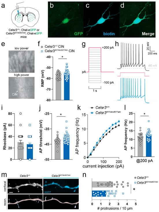 2.8. Celsr3R774H/R774H Cholinergic Interneurons Have Altered Membrane Properties and Spine Density