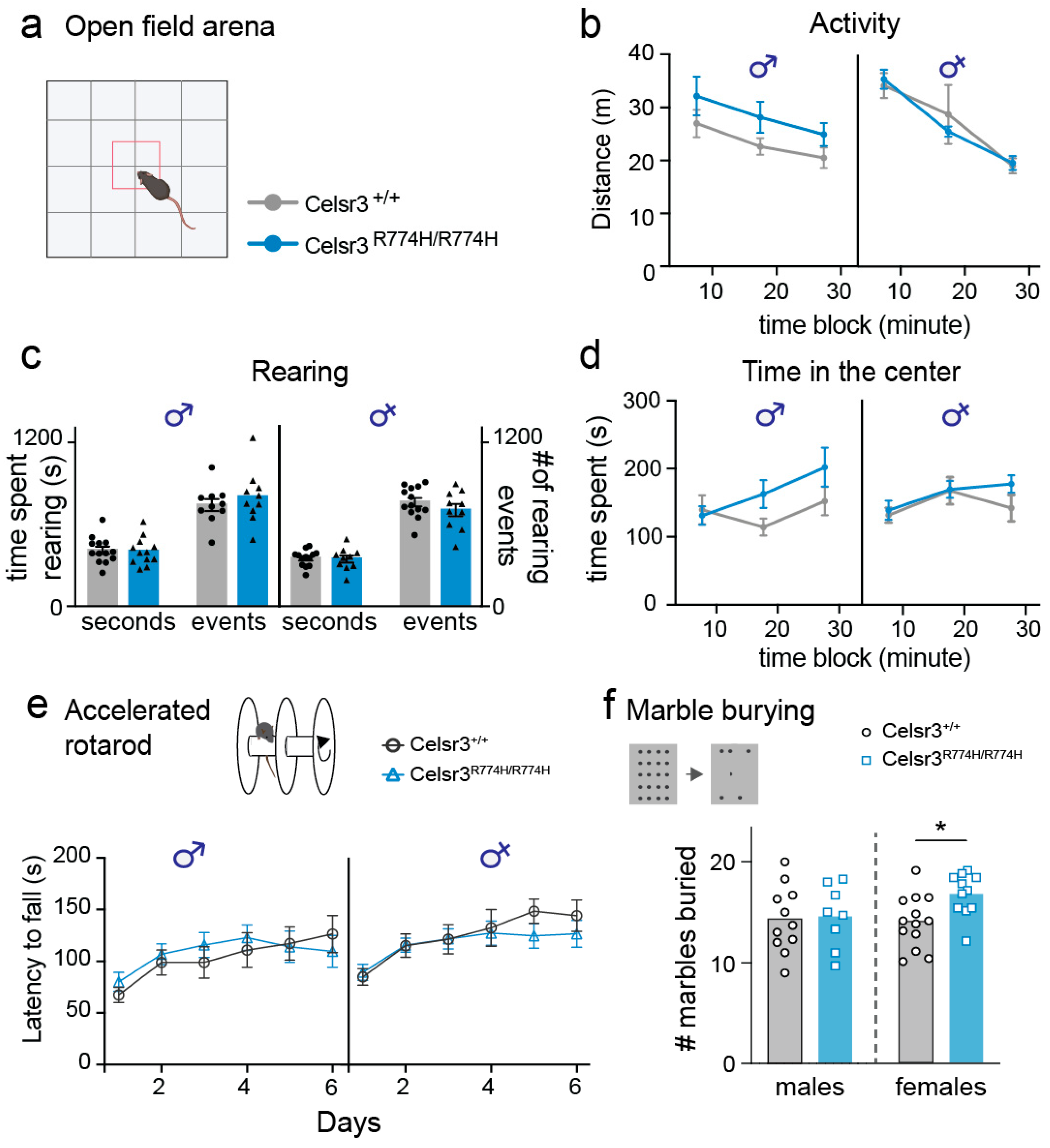 2.4. Female Celsr3R774H/R774H Mice Show Perseverative Digging Behavior