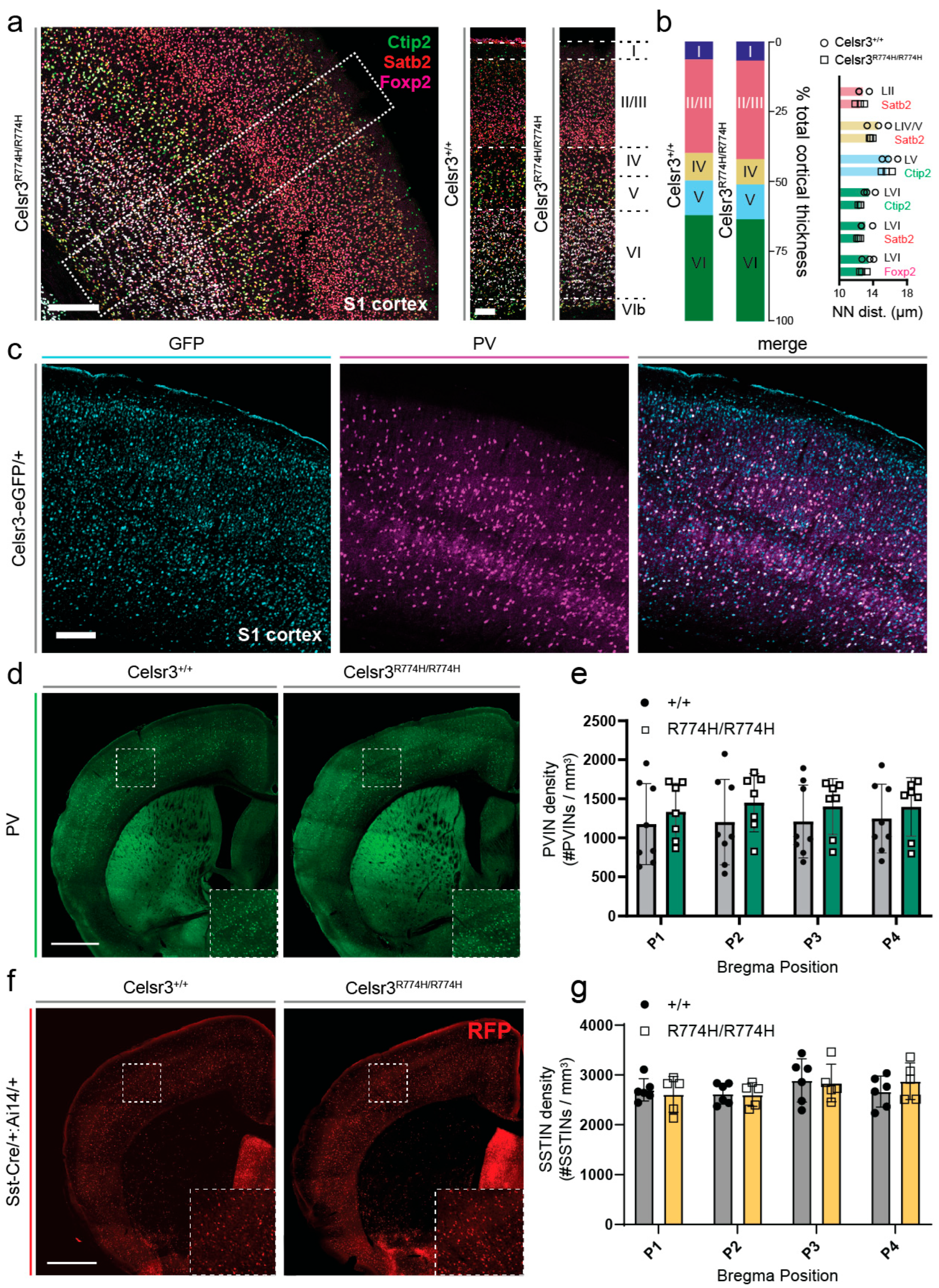 2.6. Celsr3R774H/R774H Mice Have Organized Cortical Layering and Do Not Show Interneuron Loss