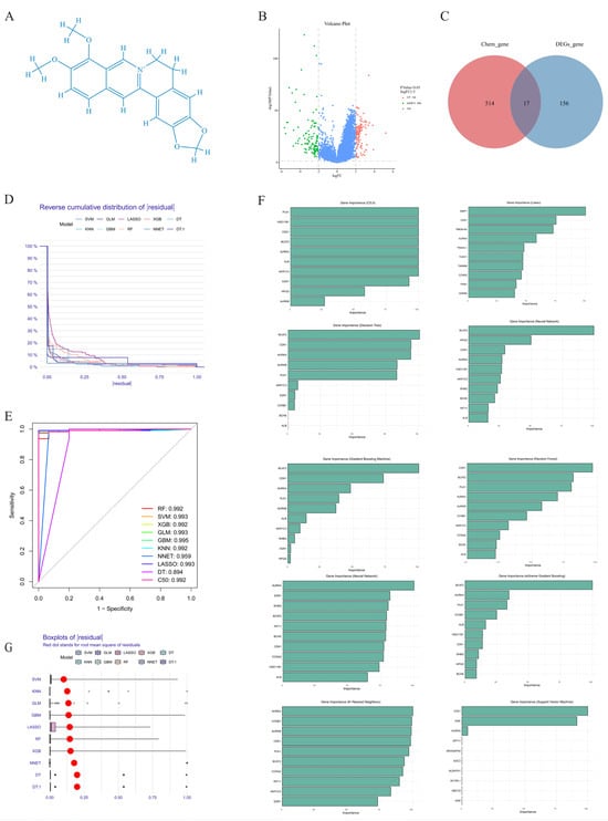 (A) Berberine structural formula. (B) Volcano plot displaying differentially expressed genes (DEGs) in hepatocellular carcinoma versus normal tissues. Red dots denote significantly upregulated genes, blue dots show downregulated genes, and black dots indicate non-significant changes. (C) Venn diagram showing intersecting target genes between berberine and hepatocel-lular carcinoma. (D) Inverse cumulative residual distribution across machine learning algorithms for PCB2 target gene prediction. (E) ROC curves evaluating predictive performance of various machine learning methods. (F) Gene feature importance rankings showing relative contributions to the predictive model. (G) Residual distribution box plots comparing algorithm performance.