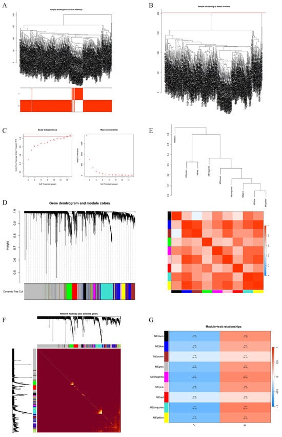 WGCNA network construction. (A) Sample clustering dendrogram. (B) Soft threshold selection (β = 10) and scale-free topology R2. (C) Gene clustering dendrogram. (D) Initial and merged module identification. (E) Module eigengene correlation heatmap showing positive (red) and negative (blue) associations. (F) Module eigengene clustering dendrogram. (G) Module-trait correlation heatmap displaying positive (red) and negative (blue) relationships.
