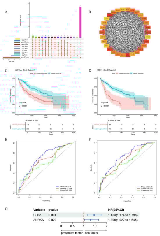 (A) Gene intersection between 10 machine learning algorithms and top 30 WGCNA hub genes with high phenotypic correlation. (B) PPI network of top 30 turquoise module genes showing highest WGCNA correlation. (C) AURKA Kaplan–Meier survival curves in hepatic cancer patients. (D) CDK1 Kaplan–Meier survival analysis in hepatic cancer patients. (E) AURKA gene ROC curve analysis in hepatic cancer patients. (F) CDK1 gene ROC curve analysis in hepatic cancer patients. (G) Univariate Cox regression results.