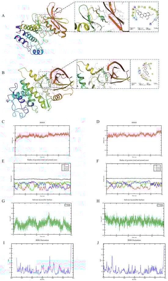 Root mean square deviation (RMSD) trends indicate whether complexes achieve stability during MD simulation, with lower RMSD values meaning greater stability. RMSD fluctuation values for complexes formed by AURKA and CDK1 with berberine stabilized after 10 ns, indicating proteins reached stable states after ligand binding (Figure 4C,D). This indicates strong binding within complexes, emphasizing stability of binding interactions between berberine and AURKA and CDK1 []. Further analysis revealed that radius of gyration (Rg) values (Figure 4E,F) and solvent accessible surface area (SASA) (Figure 4G,H) of complex systems showed slight fluctuations during motion, indicating conformational changes in small molecule-target protein complexes during motion. Root mean square fluctuation (RMSF) can indicate flexibility of amino acid residues in proteins. As shown in Figure 4I,J, RMSF values for complex systems were generally low, with only C-terminal RMSF being higher, possibly representing flexible regions of proteins. Therefore, their flexibility was low with high stability. In conclusion, complex systems showed stable binding with good small molecule–target protein binding interactions.