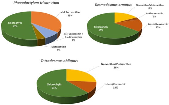 In contrast, the green microalgae Tetradesmus obliquus and Desmodesmus armatus exhibited pigment profiles dominated, among carotenoids, by lutein and the carotenoids of violaxanthin-cycle. This pattern is consistent with previous reports on chlorophytes, where lutein is the principal pigment and the violaxanthin–antheraxanthin–zeaxanthin cycle operates as the main photoprotective mechanism [21].