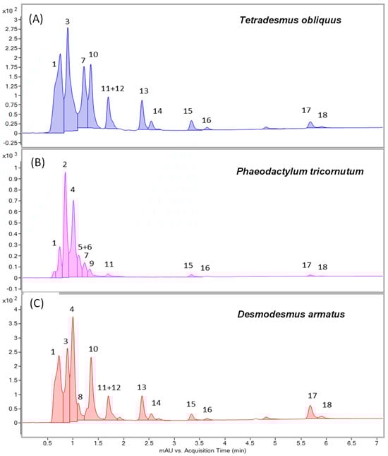 Full wavelength HPLC-DAD chromatograms (TWC, 190-640 nm) of Tetradesmus obliquus (A), Phaeodactylum tricornutum (B) and Desmodesmus armatus (C) extracts. Peak annotations are provided in Table 1.