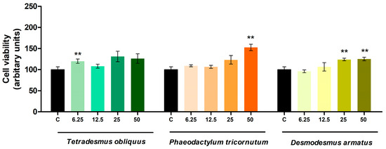 Cell viability of 3T3-L1 maturing pre-adipocytes treated with 6.25, 12.5, 25 or 50 μg/mL of Tetradesmus obliquus, Phaeodactylum tricornutum and Desmodesmus armatus microalgae extracts. Control cells (C) were not treated with microalgae extracts. Values are presented as means ± SEM. Comparisons between each dose and the control were analysed using Student’s t-test. Asterisks indicate significant differences compared to controls (** p < 0.01).