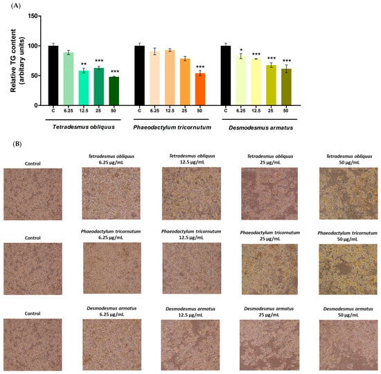 Effects of Tetradesmus obliquus, Phaeodactylum tricornutum and Desmodesmus armatus microalgae extracts at 6.25, 12.5, 25 and 50 µg/mL on triglyceride content in the adipogenic process of 3T3-L1 cells treated from day 0 to day 8 (A). Optical microscopy images show lipid accumulation at day 8 (B). Values are presented as means ± SEM. Comparisons between each dose and the control were analysed using Student’s t-test. Asterisks indicate significant differences compared to controls (* p < 0.05; ** p < 0.01; *** p < 0.001). TG: triglyceride.