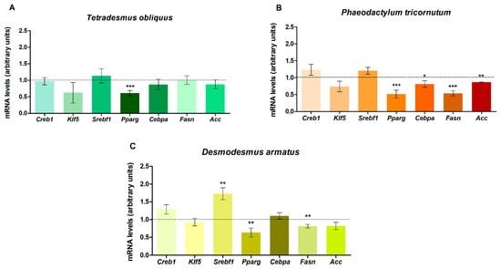 Effects of 50 µg/mL of Tetradesmus obliquus (A), Phaeodactylum tricornutum (B) and Desmodesmus armatus (C) microalgae extracts on gene expression of Acc, Cebpa, Creb1, Fasn, Klf5, Ppara and Srebf1 in 3T3-L1 maturing pre-adipocytes treated from day 0 to day 8. Values are presented as means ± SEM. Comparisons between each microalgae and the control were analysed using Student’s t-test. Asterisks indicate significant differences compared to controls (* p < 0.05; ** p < 0.01; *** p < 0.001). Dashed lines represent values from the control cells. Acc: acetyl-CoA carboxylase; Cebpa: CCAAT/enhancer-binding protein α; Creb1: cAMP responsive element-binding protein 1; Fasn: fatty acid synthase; Klf5: Kruppel-like factor 5; Pparg: peroxisome proliferator-activated receptor γ; Srebf1: sterol regulatory element-binding transcription factor 1.