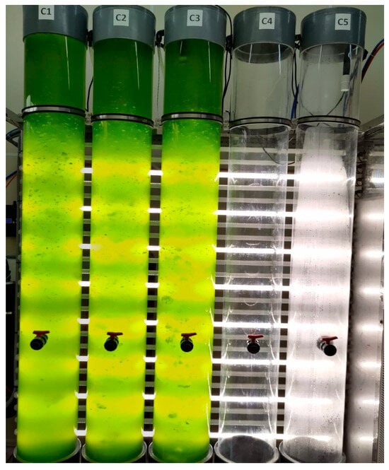 The cultures were grown photoautotrophically in 100 L bubble column PBRs (Figure 6). The PBR consisted of a clear methacrylate column with an internal diameter of 250 mm and a height of 2 m. To mix the culture broth, sterile filtered air was bubbled through the vessel at a flow rate of 6 to 8 L/min. Illumination was provided by 35W VALOYA LED tubes (Valoya, Helsinki, Finland) with the NS12 spectrum, delivering an intensity of 250 µEm−2s−1 measured at the midpoint of the empty column. A 16:8 h light:dark cycle was maintained, and the temperature was controlled at 19 ± 2 °C. The pH was regulated at pH 8 through automatic injecting of carbon dioxide as needed. The fresh culture medium was prepared following the same protocol as for the inocula.