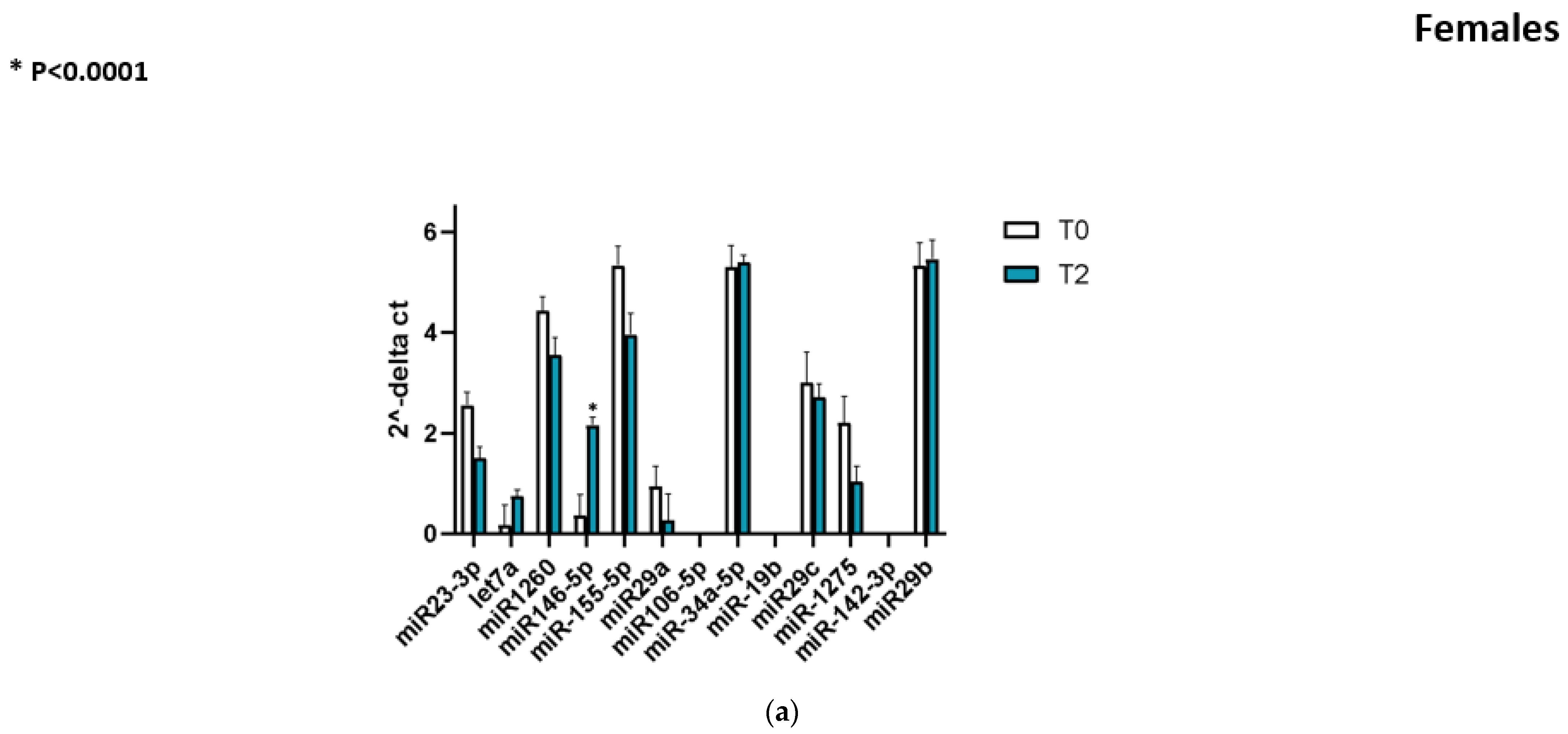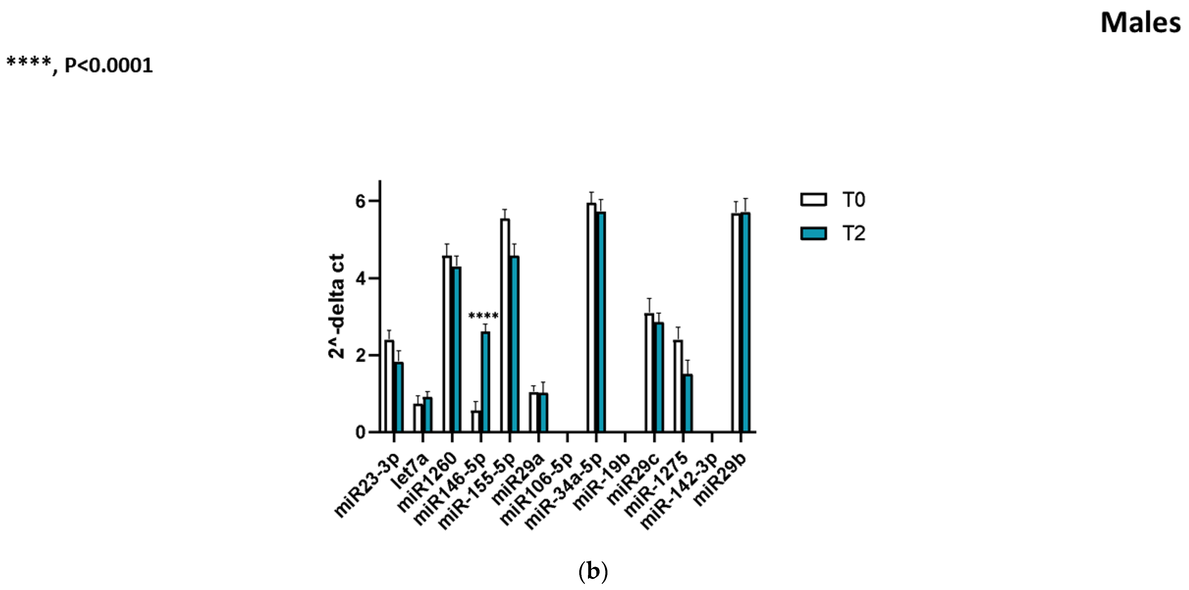 - Vallelunga, A.; Iannitti, T.; Somma, G.; Russillo, M.C.; Picillo, M.; De Micco, R.; Vacca, L.; Cilia, R.; Cicero, C.E.; Zangaglia, R.; et al. Gender differences in microRNA expression in levodopa-naive PD patients. J. Neurol. 2023, 270, 3574–3582. [Google Scholar] [CrossRef] [PubMed] [PubMed Central]