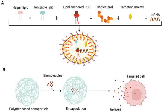 A lipid nanoparticle-based delivery system (LNP) is appropriate for mRNA encapsulation. It uses cationic lipids, helper phospholipids, cholesterol and polyethylene glycated lipids. The delivery system incorporates perfect mRNA complexity, lipid nanoparticle stability, the intracellular discharge of mRNA and a deterrence of non-specific interactions (Figure 1A). These revolutionary LNPs emerged with the success of mRNA vaccines during the COVID-19 pandemic. Upon administration, LNPs facilitate the delivery of mRNA into host cells, where it is translated into antigenic proteins, thereby eliciting a robust immune response. The incorporation of ionizable lipids has been particularly important, as this approach enhances endosomal escape, allowing the mRNA to reach the cytoplasm effectively. This is crucial for initiating the desired immune response and ensuring the effectiveness of the vaccine [25]. LNPs exhibit many advantages, such as the efficient encapsulation and compression of mRNA, stimulation of endosomal escape, enhancement of cellular uptake, prevention of mRNA degradation in the extracellular environment, legal approval for human usage and large-scale production [26].