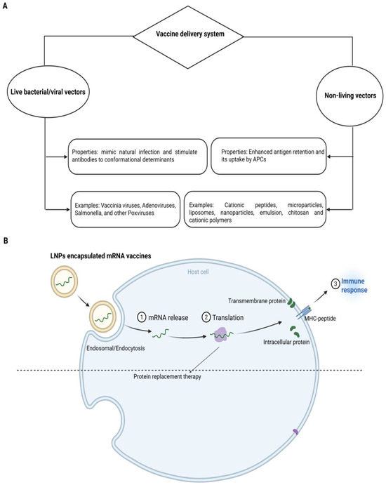 Systems of vaccine delivery. (A) Live or biologically-based gene delivery systems and non-live delivery systems. Non-live delivery systems include liposomes, cationic lipids, polysaccharides, cationic peptides, micro/NPs and cell-penetrating peptides. (B) Mode of operation of mRNA-based vaccines. As nucleases degrade the mRNA and this degraded mRNA cannot cross the cell membrane owing to its negative charge and large size, delivery demands encapsulation in vehicles, e.g., lipid NPs. Cellular uptake of lipid NPs starts with the endocytosis process followed by the endosomal body escape, degradation of lipid NPs and release of mRNA into the cytosol. For therapeutic applications, mRNA is translated into protein to act as vaccines or protein replacement therapy.