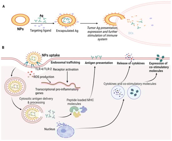 Immunotherapy based on NPs. (A) Outline of the mechanism of immunotherapy based on an NP-dependent tumor peptide vaccine. (B) Molecular mechanisms for immune stimulation through NP-based vaccination. The NPs can have immuno-stimulating properties upon uptake through receptor (TLR-4) activation and ROS. These pathways transcribe pro-inflammatory genes, resulting in the translation of co-stimulatory molecules and pro-inflammatory cytokines. NP-based cytosolic delivery of Ags ensures that the Ag enters Ag processing. Peptidase and proteasome-mediated machinery deliver oligopeptides (processed Ags) to be presented in MHC molecules which are exposed to the cell’s surface. Increased cytosolic Ag delivery with immune-stimulatory properties of NPs results in effective priming of Ag-specific T cells.