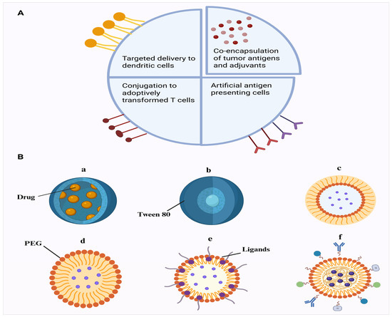 Multi-functional design of nanoparticles for cancer therapy. (A) The nanoparticle surface can be functionalized with antigens (Ags) or antibodies specific to dendritic cells (DCs), while adjuvants and tumor antigens can be co-loaded into the nanoparticle core. Additionally, MHC–antigen complexes and co-stimulatory binding ligands can be incorporated to act as synthetic APCs. Additionally, NPs with immune potentiators can be conjugated on T cells to ameliorate adoptive T cell therapy. (B) An example of polymeric nanoparticles used in neurodegenerative diseases treatment. (a) Nanocapsules comprise core shell structured nanoparticles in which the drug is enclosed within a polymeric membrane. (b) Tween 80-coated PBCA nanoparticles compose poly(butyl cyanoacrylate) particles coated with surfactant Tween 80 to facilitate blood–brain barrier penetration. (c) Pegylated nanospheres encompass polymeric nanospheres surface-modified with PEG to improve circulation time and biocompatibility. (d) Nanospheres coated with ligands and/or antibodies constitute functionalized particles for targeted delivery to specific receptors. (e) Nanospheres coated with ligands and/or antibodies. (f) Pegylated nanospheres comprise extra ligands and antibodies as dual-modified nanospheres combining stealth (PEGylation) and receptor-specific targeting. This mechanism provides hope for development of nanoparticle-based vaccines in future.