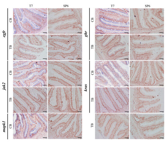 Localization of key genes in the intestine of group TB and group CB T. ovatus. Scale bars = 40 µm.