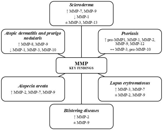 Key findings from studies on MMP expression in selected inflammatory skin diseases. ↑ Increased, ↓ Decreased, ↔ No Change, or ± Conflicting Data. Diagram prepared based on sources [,,,,,,,,,,,,,,,,,,,,,,,,,,,,,,,,,,,,,,,,,,,,,,,,,,,,,,,,,,,,,,,,,,,,,,,,].