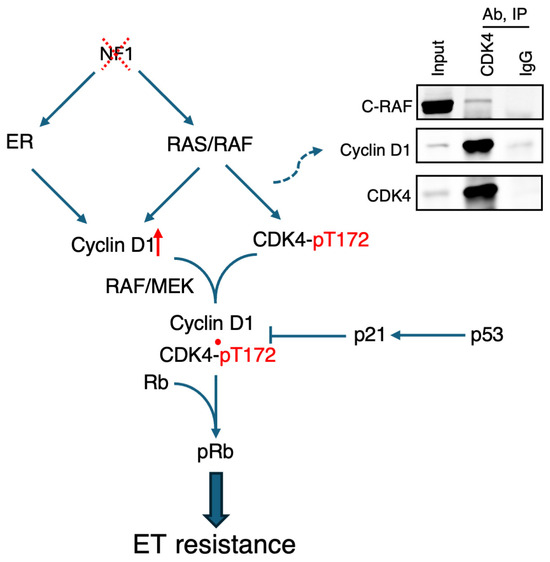 Model. NF1 depletion co-activates ER and RAS signaling, which converge on the CDK4/6-Rb pathway to bypass endocrine therapy by cyclin D1 induction (red upward arrow), and CDK4 phosphorylation at T172. p53 may modulate with this pathway via regulation of p21. Upper right: co-immunoprecipitation showed interaction between CDK4 and CRAF in ER+ T47D cells.