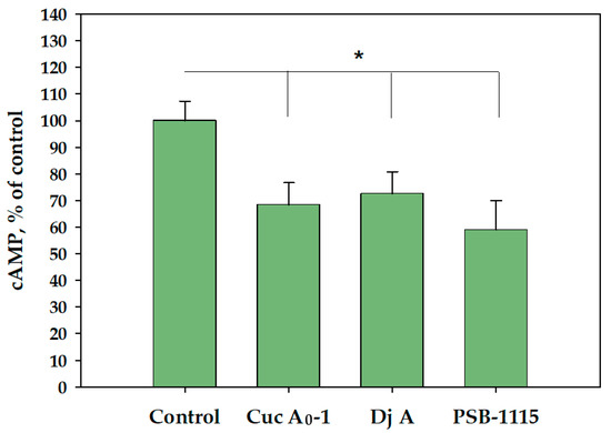 Evaluation of cAMP content in MDA-MB-231 cells after treatment with Cuc A0-1 (1 μM), Dj A (2 μM), and PSB-1115 (1 μM) for 6 h using an ELISA kit. * p < 0.05 compared with control (untreated MDA-MB-231 cells).