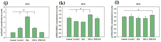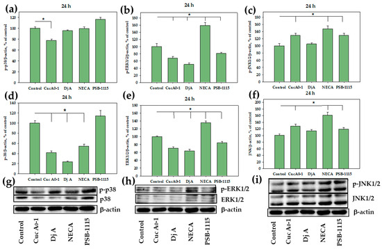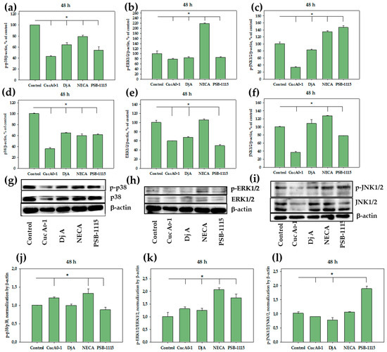 Effect of Cuc A0-1 (1 µM), Dj A (2 µM), PSB-1115 (1 µM) and NECA (1 µM) on p38/p-p38, ERK1/2/p-ERK1/2, JNK1/2/p-JNK1/2 in MDA-MB-231 cells treated for 48 h. Normalization of p-p38 (a), p-ERK1/2 (b), p-JNK1/2 (c), and p38 (d), ERK1/2 (e), JNK1/2 (f) levels relative to the housekeeping protein β-actin. Western Blot results of p38 and p-p38 (g), ERK1/2 and p-ERK1/2 (h), JNK and p-JNK (i) levels. Effect of Cuc A0-1 (1 µM), Dj A (2 µM), PSB-1115 (1 µM) and NECA (1 µM) on protein expression ratio p-p38/p38 (j), p-ERK1/2/ERK1/2 (k), p-JNK1/2/JNK1/2 (l) in MDA-MB-231 cells treated for 48 h, normalized to β-actin. Protein levels were normalized to the control group (untreated cells). * p < 0.05 compared to control (untreated MDA-MB-231 cells).
