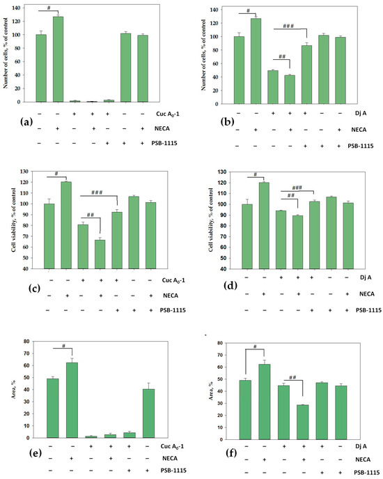 Second, the influence of the compounds on proliferation was tested using the MTS method after 9 days of exposure. The results demonstrated that NECA led to an increase in proliferation by 20%, whereas Cuc A0-1 and Dj A inhibited proliferation by 20% and 6%, respectively (Figure 6c,d). The combined action of Cuc A0-1 and NECA increased the antiproliferative effect to 34%, whereas the combined action of Cuc A0-1 and PSB-1115 significantly decreased the antiproliferative effect to 8%, which was comparable to that of the control cells (Figure 6c). The combined action of Dj A and NECA led to an increase in the antiproliferative activity from 6% to 11%, whereas the combined action of Dj A with PSB-1115 restored the proliferation of MDA-MB-231 cells to control values (Figure 6d). The results of the MTS method in relation to the action of PSB-1115 alone and in combination with NECA were the same as those obtained using the cell counting method (Figure 6a–d).