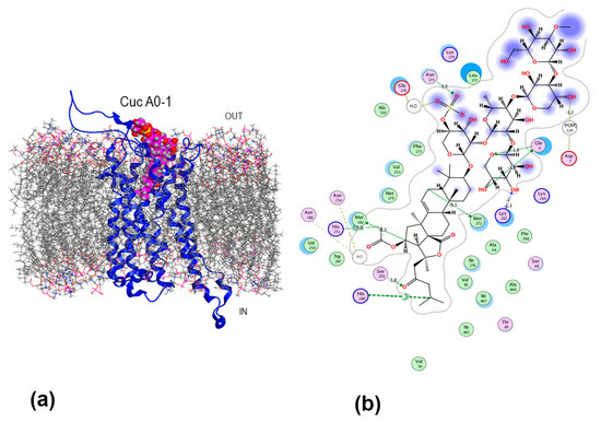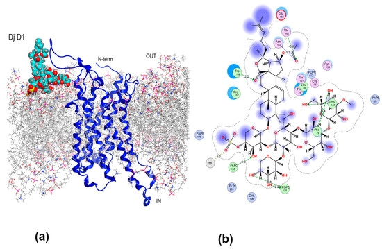 The binding of Dj D1 (Figure 1), which was not toxic to MDA-MB-231 cells at the tested concentrations [30], to A2BAR was modeled for comparison with the modes of binding of the active glycosides. Dj D1 preferentially bound to the lipid membrane and occupied the space between the membrane surface and ECL2 of A2BAR (Figure 9a). Although this position was not among the top positions of energetically efficient docking solutions, this structure was chosen for further analysis to determine whether Dj D1 modulates A2BAR. The glycoside formed non-covalent interactions preferably by its carbohydrate moiety with an estimated binding energy of −15.26 kcal/mol. The sulfate group attached firmly to the PAPE and PLPC lipid heads contributing −3.21 kcal/mol and −2.29 kcal/mol, respectively (Figure 9b). The branched carbohydrate moiety can directly bind to the transmembrane helix 3 (TM3) of A2BAR by H-π interaction of the OH-group at C-5 of the 3-O-methylglycose unit with the Phe756-ring (−0.5 kcal/mol) as well as by VdW contact of the hydroxymethylene group of the second glucose unit with Tyr76. Additionally, Dj D1 interacted with the neighboring lipid POPC through hydrogen bonds (HBs) of OH-groups at C-3 and C-4 of the fifth (xylose) residue (−2.2 kcal/mol and −0.4 kcal/mol), which in turn formed π-anion interactions with Phe80 of A2BAR. The 16-OAc and oxo-group of 18(20)-lactone as the H-acceptors formed an extensive network of HBs with Asn163 (−3.3 kcal/mol), Trp158 (−2.2 kcal/mol), Thr162 (−0.6 kcal/mol), and Lys147 (−0.4 kcal/mol) stabilizing the glycoside in the complex. Nevertheless, the glycoside did not penetrate either the orthosteric or allosteric binding sites of A2BAR.