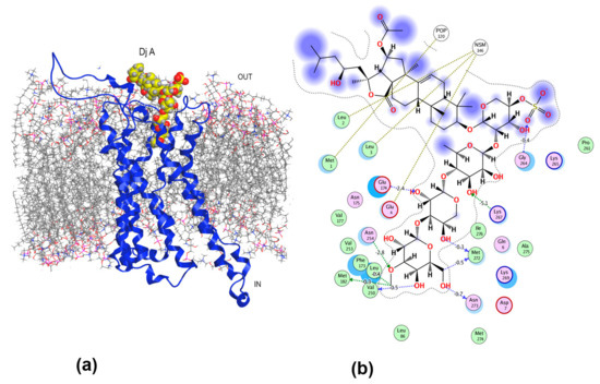 In silico modeling of Dj D1 binding with A2BAR showed that its carbohydrate chain preferentially formed strong bonds with phospholipid heads of membrane lipids and apparently facilitated the aglycone incorporation into the inner part of the bilayer, which was confirmed earlier by the ability of the glycoside to destroy the erythrocyte membrane but not affect cancer cells [30,52]. Hence, despite an extensive network of non-covalent interactions (ionic, HBs, hydrophobic, VdW) (contributing up to –14.86 kcal/mol) and the participation of TM3 receptor helix (H-π −0.4 kcal/mol and VdW –3.75 kcal/mol) and ECL2 loop (−11.76 kcal/mol, HBs, hydrophobic and VdW) in the glycoside binding, none of interactions with functionally important residues responsible for recognizing of agonists or antagonists by ARs were found for Dj D1.