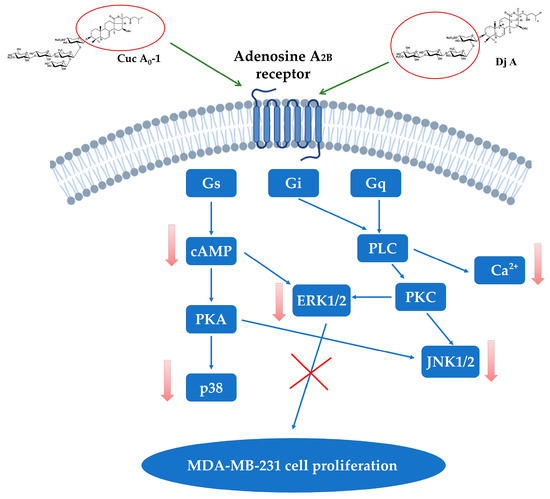 A2AAR and A2BAR antagonists have been shown to reduce tumor metastasis in various mouse models of melanoma, ovarian, bladder, and breast cancers [17,34]. It is well established that G protein-coupled receptors can transduce effects through more than one signaling pathway. A2BAR activation initiates both the Gs/adenylyl cyclase (AC)/cAMP and Gq/phospholipase C/Ca2+ signaling pathways to mediate its physiological effects. The mode of G protein coupling is not only cell type-dependent but can also cause diverse cell responses, such as anti- or pro-inflammatory responses [12]. A2BAR-mediated activation MAPK [35,36,37,38] promotes intrinsic apoptosis by phosphorylating Bcl-2 and Bax [39]—these same proteins are also modulated by the glycosides Cuc A0-1 and Dj A [20].