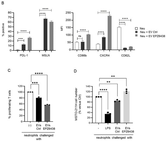 Analysis of neutrophils challenged with EVs from MSTO211H spheroids. (A,B) Representative plots and histograms from FACS analysis, and bar graphs showing the percentage of positivity of PDL-1 and MSLN, and the mean fluorescence intensity (MFI) of CD66b, CXCR4, and CD62L on the surface of neutrophils incubated for 3 h with EVs isolated from MSTO-211H MCSs ± 72 h of treatment with EPZ-6438. (C) Bar graph showing the percentage of proliferating PMA-stimulated T cells after 24 h of incubation with naïve neutrophils or challenge with EVs from untreated or EPZ-6438-treated MSTO-211H MCSs. (D) Bar graph showing the number of MSTO-211H MCSs incubated for 24 h with naïve neutrophils or challenged with EVs from untreated or EPZ-6438-treated MSTO-211H MCSs, expressed as the percentage of untreated MCSs. The histograms in (A–C), show the means ± SD, ** p ≤ 0.01, *** p ≤ 0.005, **** p ≤ 0.001, ns: not significant.