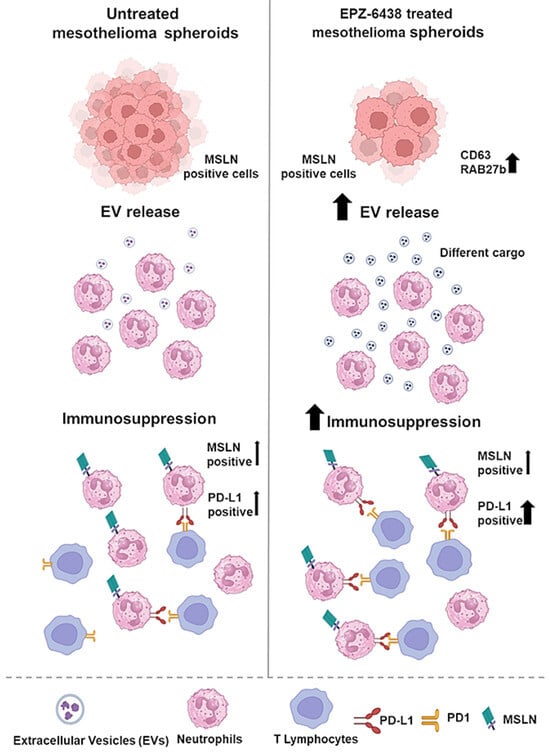 Proteomic analysis of PM spheroids treated with EPZ-6438 revealed a significant increase in the expression of RAB27b and CD63, indicating increased release of EVs. Subsequent purification and analysis of EVs confirmed these findings. Here, we present initial evidence that EVs derived from PM cells, particularly those derived from EPZ-6438-treated cells, induce PD-L1 expression in neutrophils. Our study is the first to demonstrate that PM-EVs trigger the development of immunosuppressive neutrophils, leading to the inhibition of T-cell immunity (Figure 5). These results highlight the significant role of EVs in creating an immunosuppressive microenvironment, shedding light on the regulation of neutrophil biology and function in the PM.