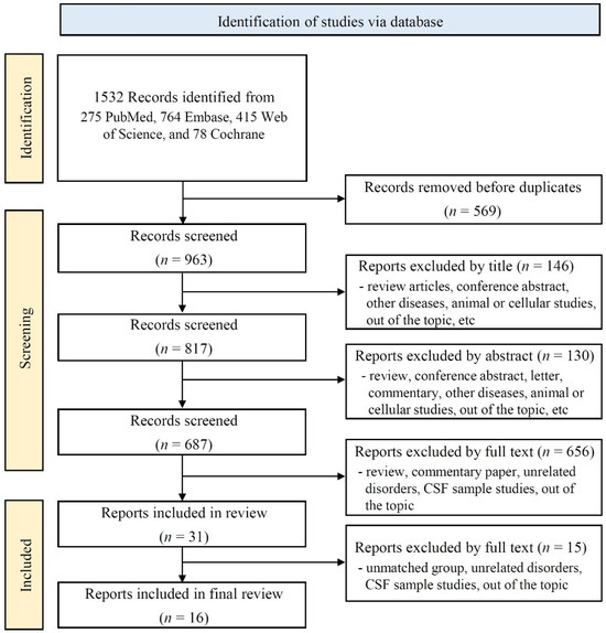 A total of 1532 records were initially retrieved from the database searches, including 78 from the Cochrane Library, 764 from Embase, 275 from PubMed, and 415 from Web of Science (Figure 1). After removing the duplicates, 963 records were retained for screening. Of these, 817 were identified after title screening, 687 after abstract screening, and 31 after full-text review. Following a thorough review of the full texts, 16 studies met the eligibility criteria and were included in the quantitative synthesis.