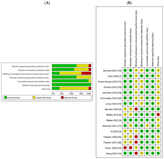 Quality assessment. Bar chart and bar chart of bias risk assessment. Different colors (green, red, yellow) and symbols (“+”, “−“,” “?”) represent “low risk bias,” “high risk bias,” and “unclear,” respectively. The quality assessment chart includes the percentage of bias risk at each level graph, and the level of applicability concerns for each specific item in the study. (A) Risk of bias graph (B) Risk of bias summary.
