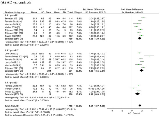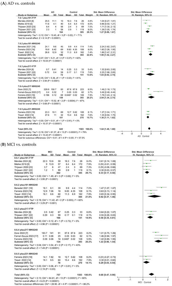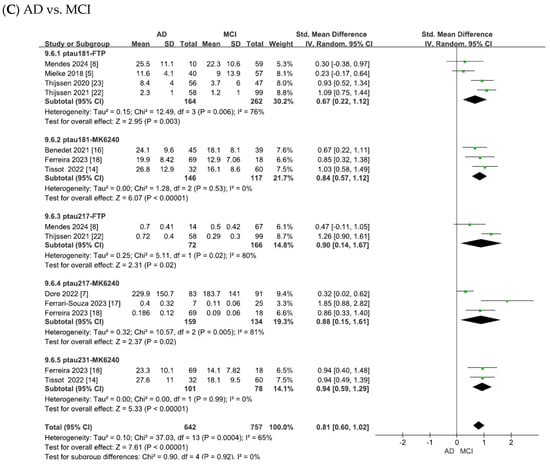 Furthermore, the overall pooled results across all plasma tau biomarkers for the AD vs. control, MCI vs. control, and AD vs. MCI group comparisons are presented in Supplementary Figure S3.