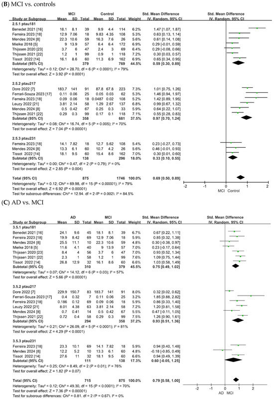 The results of this meta-analysis are summarized in Figure 3. Pooled analyses were performed separately for p-tau181, p-tau217, and p-tau231. Group comparisons were conducted between the (A) AD and control, (B) MCI and control, and (C) AD and MCI groups.